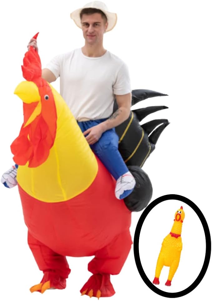 ・セット内容:着ぐるみ(大人用フリーサイズ 男女兼用(身長150-190cm))、送風用ファン、オリジナル説明書、チキンが叫ぶおもちゃ(長さ25㎝)※膨らますには単三電池4本が必要です。