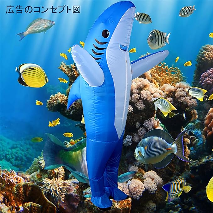・面白い着ぐるみ——人食いサメはもう海にはいなかったのに、突然街を歩いていませんか? なんとも興味深い絵ですね。みんなにサプライズと楽しみを持っていくとともに自分もずいぶん楽しめます。このコスチュームは誕生日パーティーやハロウィーンや出し物に使えます。それに家族へのいいプレゼントになります。