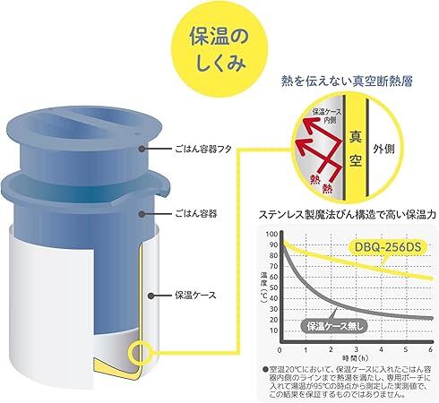 ・素材・材質:【保温ケース】ステンレス鋼(アクリル樹脂塗装) / 【ごはん容器】本体:ポリプロピレン / フタ:ポリプロピレン(発泡ポリプロピレン内蔵) / 【おかず容器】本体:ポリプロピレン / フタ:シリコーンゴム / 【ハシ】飽和ポリエステル樹脂 / 【ハシケース】ABS樹脂 / 【ポーチ】外生地:ポリエステル / 内生地:ポリエステル / クッション(断熱材):発泡ポリエチレン