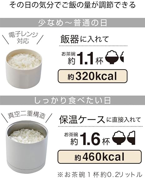 ・お茶碗に約1.1杯 (飯器)、約1.6杯 (保温ケース)