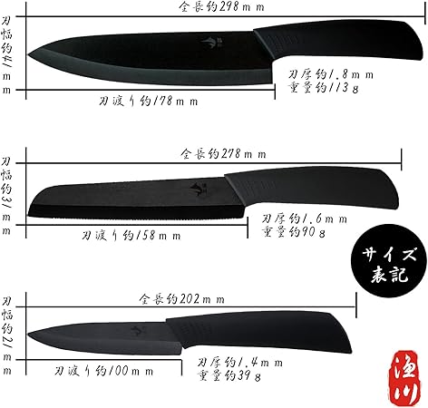 ・「3本セット仕様」 ◎シェフナイフサイズ/刃渡り約178mm、柄丈約120mm、重量約113g ◎パン切りナイフサイズ/刃渡り約158mm、柄丈約120mm、重量約90g ◎ペティナイフサイズ/刃渡り約100mm、柄丈約100mm、重量約39g
