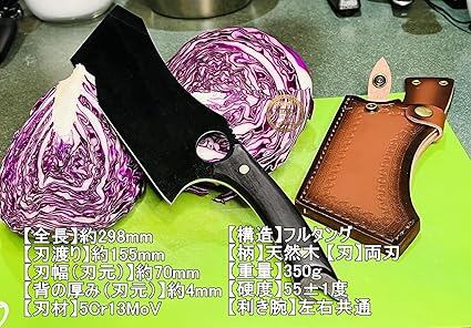 ・【全長】約298mm 【刃渡り】約155mm 【刃幅(刃元)】約70mm 【背の厚み(刃元)】約4mm 【刃材】5Cr13MoV 【構造】フルタング 【柄】天然木 【刃】両刃 【重量】350g 【硬度】55±1度 【利き腕】左右共通