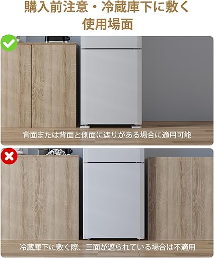 ・【購入前注意・冷蔵庫下に敷く・使用場面】冷蔵庫下に敷く際、三面が遮られている場合は不適用。背面または背面と側面に遮りがある場合に適用可能。