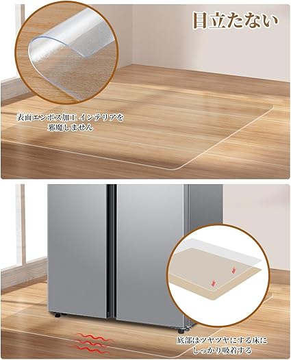 ・【床のプロテクター緩衝材&エンボス細かい凹凸加工】:この床のプロテクターはソフトな緩衝材を施され簡単に敷くだけで、冷蔵庫の脚は床に触れず、床やカーペットをキズや色移りなどから守てくれます。透明マットの表面はエンボス処理を採用され、従来のpvcフロアマットのようなベタつく感じがありません。傷防止マットの裏面はツヤツヤにすることで床に馴染み、クリアマット自体がズレにくくなっています。