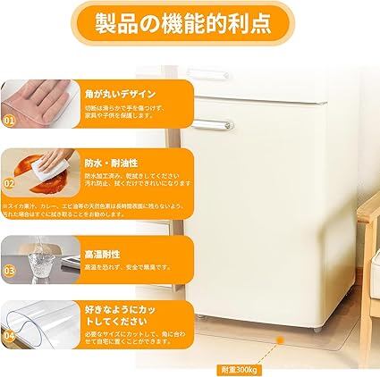・【優れた品質】"ガラスの250倍"の強度を誇り、ハンマーなどで強打しても割れません!地震が起きても破損・飛散することがなく、 冷蔵庫 を置いた時にできる 傷 や 凹み から床を守ります!従来品より厚みが増し、さらに床への キズ防止 効果がアップ!従来品(1.5mm)より素材厚を2mmにアップデート!新世代のアップグレードされたPVC素材でできており、透明性が高く、味がなく。耐久力が大幅にアップされた 変形しにくい、 耐衝撃性、凹み防止効果抜群で 耐荷重は約300kgと 変形や変色などの心配がありません.変形し難く、地震などの災害時でも破損・飛散は無い。すべての角をさらに丸く処理された安全設計、お子様やペットがいるご家庭でも安心して使える.