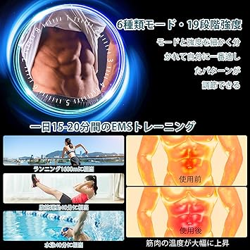 ・【EMS 腹筋ベルト 多種類なモード&19段階強度 でお気軽筋トレ】EMS ベルト 特定の周波数のマイクロ電流で筋肉を振動させ、電流で筋肉を動かし、運動の効果を実現する。筋トレグッズ モードや強度が組み合わせて軽快なポリリズムの刺激を与え、強力かつ弾力性の刺激で深層の筋力を増加させ、初心者にもレディース/マンズにも、特にサラリーマンや運動不足の方にも多様なニーズを満足し、健康と体型管理に興味のある方に、ぜひお試しいただきたい商品です。