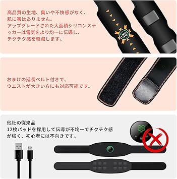 ・【経済的USB充電式&延長ベルト付き】コードレスで使用できるという便利なEMSマシンで、電池交換不要の充電式を採用され、一度フル充電の状態で、20時間ぐらい使えます。腹筋トレーニング器具は付属のコントローラーは液晶画面が搭載して日本語の液晶画面でモード、強度を表示されます、身体に装着して使用時に、作動している状態(モードの種類、段階の強度)を見て確認できます、もっと安心に、もっと明瞭にトレーニングが楽しめます。おまけの延長ベルト付きで、ウエストが大きい方にも対応可能です。(本体+延長ベルト=128cm)ベルトの長さの適用範囲は72cm〜128cmです。ウエスト72cm未満の方はご使用いただけません。