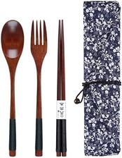 ・【食器セット内容】木製カトラリー4点セット(箸袋+箸+スプーン+フォーク)軽量の布製ポーチは3つの木製旅行用具をまとめて持ち運びが簡単です。 この旅行道具セットは、外出先での使用に最適です。