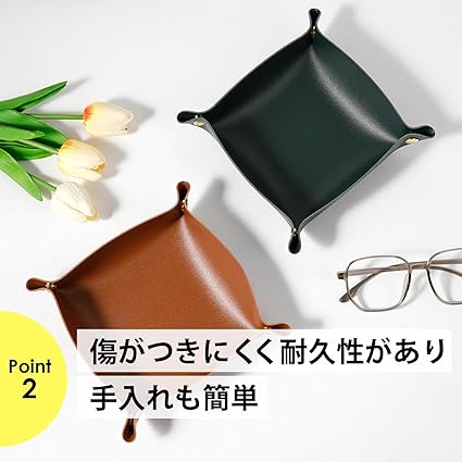 ・【いつもでもどこでも活躍する】PUレザー製なので傷がつきにくく耐久性があり、汚れても手入れも簡単。ちょっとした置き収納に便利なサイズで丈夫な素材なので置く場所も選びません。汚れても手入れも簡単。いつまでもきれいにお使いいただけます