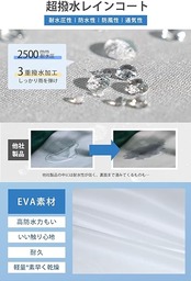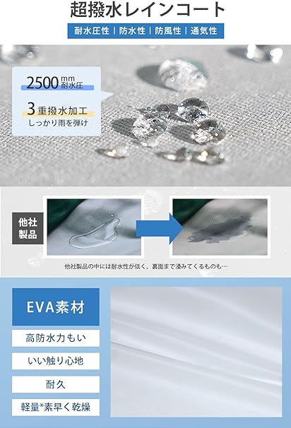 ・【超撥水*防水*耐久】ファスナー+ボタンの二重設計により、ファスナーを閉じてボタンを留めることで雨水や風の侵入をしっかり防げるレインコートです。エコなEVA素材を採用し、防水力高め、耐水圧2500mm、丈夫で耐久性にも優れています。3重撥水加工により、水が染み込むことはない。収納袋付き、リュックサックなどに入れて楽々持ち運べるので、旅行や出張、アウトドアに急な雨が降っても心配はありません。