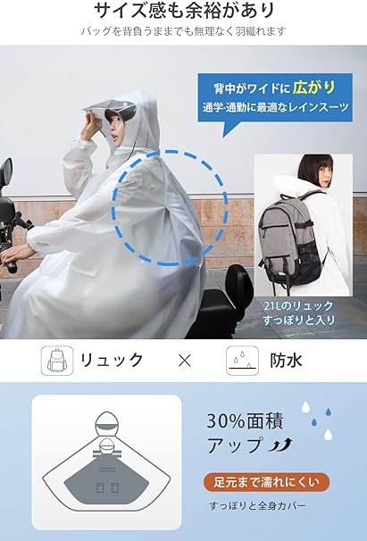 ・【男女兼用大きめサイズ】街歩きはもちろん、自転車、バイク、原付き運転にも対応可能なレインコートです。背中のスナップボタンを開けると、リュックを背負っても余裕に使える大きいサイズに広がり、膝下までカバーするロング丈に加え、体をすっぽり覆い、雨から守りながら、窮屈さがなく動きやすい。通勤通学に最適なレインポンチョで、台風対策、梅雨対策として大活躍。