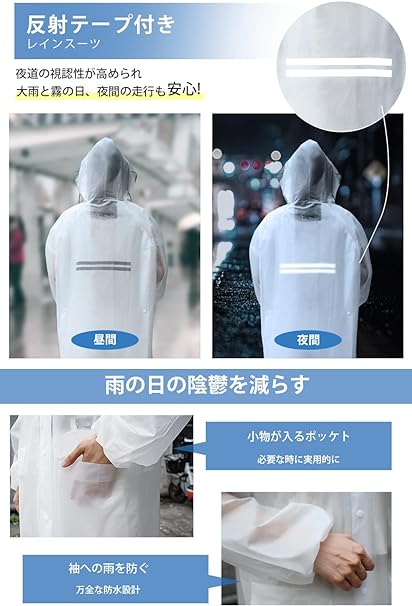 ・【細部までこだわり】①フラップ付きのポケット:携帯や鍵などちょっとした小物を収納する時に実用的。②ゴム入りの袖口:袖への雨風の侵入を防ぎ、自転車運転時や雨の日の作業時に便利。③背中に反射テープ付き:車などからの視認性が高く、視界が悪い雨の夜間でも安全性アップ。日常での使いやすさを重視し、デザインと防水性を両立させたレインウェアで、歩行や自転車運転でもより便利で快適に使えます。