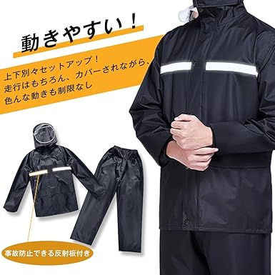 ・【フード簡単収納・裏面メッシュ付き・2wayカウス】 このレインスーツは、フードを簡単に収納できる設計と裏面にメッシュが付いた2wayカウスです。フードはジャケットの襟元に隠れるように収納でき、晴れた日には必要ない時も邪魔になりません。雨が降ってきた時には、簡単にフードを取り出して頭部を保護できます。また、裏面にメッシュが付いているので、通気性が高く、蒸れずに快適に着用できます。これにより、暑い日やアクティブなアクティビティでも快適に過ごすことができます。