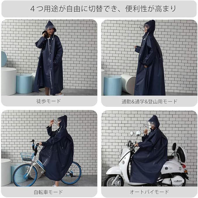 ・【様々の場面に適用】自転車を乗る時や、ショッピング、通勤、通学、散歩、旅行、スポーツマッチを楽しむ時など色んな場合で利用できます。背中の後ろ面と側面に白いボダンが閉める状態では徒歩モードです。後ろの二つボダンを開くと、通勤&通学&登山用モードになります。また後ろの片面ずつ2個ボダンを開くと、自転車モードです。さらり、帽子のひさしが前に調整し、またレインコートの全部ボダン全部開くと、オートバイモードです。