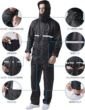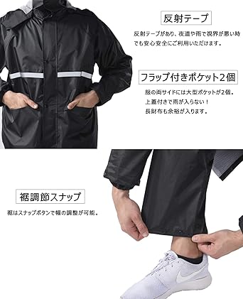・【裾調節ボタン・ウェストゴム】裾はスナップボタンで幅の調整が可能です。ズボンの腰部分はゴム入りですから、服の上からはいても動きやすく、通勤・通学・自転車・バイクなどの日常使いはもちろん、キャンプや釣り、ハイキングなどのアウトドアまで幅広くご使用いただけます。梅雨シーズンの豪雨・台風対策などでも活躍間違いなしです!