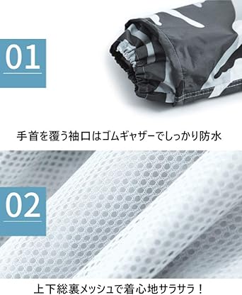 ・【透湿性能】表面生地(PVC素材)は、水滴よりも小さいな穴が無数に空いており、外からの雨は弾き、ウエア内の蒸れはその穴から逃します。また、裏地全体にメッシュ素材を使用しているため、コーティングされたウェアの生地が、肌に直接触れるのを防いでくれるので、快適なさらっとした着心地を保てます。また、ズボンの前部分2箇所に通気口があり、ウェア内の蒸れや熱気を外に放出します。
