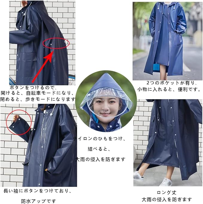 ・【多機能】 ①レインウエアボダンもしくはファスナーを閉じていただければ、普通に歩けます。②通勤、通学、登山用、自転車用、オートバイに適用します:レインウエアの後ろに2つボタンが隠れます。裾幅を自由に調整して体にフィットでき、強風や豪雨の時も大丈夫です。背中にも余裕があるため、リュックを持っても着用できます。更に着脱しやすいです。③袖口に調整ボタンがあり、雨の侵入が防げます。④側面に二つ大きなポケットがあり、携帯電話や鍵などを入れてとても便利です!