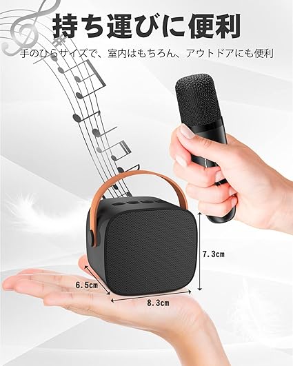 ・【手のひらサイズ】手のひらサイズのボディで持ち運びの手軽さだけでなく、手に取りやすいハンドルも付き、引っ掛けて場所を選ばずに使えます。どこにでも持ち運べて好きな歌が歌え、自宅やお出かけ先でカラオケが楽しめる!