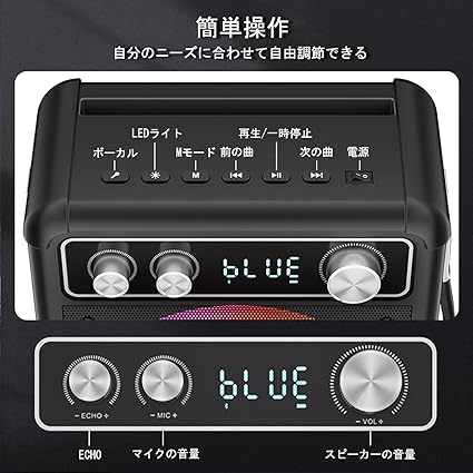 ・【簡単な操作】液晶ディスプレイを装備し、電量残量や運転状況を一目で確認することができます。スピーカーの上部に機能ボタンでエコー、6種類ライトモード、再生音量など調節可能、スマホ側でも音楽再生などの操作が可能です。カラオケ音源じゃなくてもカラオケ音源として使えるボーカルカット機能も付き!直感的な操作ができるので初心者の方におすすめとなっています。