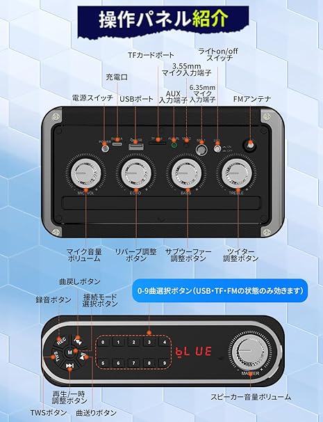 ・【シンプルな操作】録音音声/AUX入力/ TFカード / USB / BT /マイクロUSBは携帯電話、Ipad、テレビ、PCなどの外部デバイスに対応します。テレビのヘッドホンジャックや多くの音響機器と接続できる汎用性の高い3.5mmステレオミニプラグでの接続にも対応しています。リモコン付き、スマホのみではなく、リモコンで遠距離(10メートル)操作もできます。 操作バネルに6.35のマイク入力端子付き、ギターにも適用。