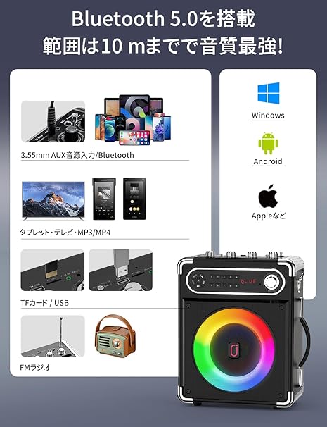 ・【コンパクト軽量&高容量バッテリー】RGB ライト付き、ポータブルスピーカー重量は2.96KGです。軽くて運び便利、移動時に手軽に持ち運びできます。付属ストラップを付け、肩に掛けても重く感じません。高性能バッテリー(内蔵の3.7V / 5200mAh充電式大容量リチウムイオンバッテリーで)と低消費電力により、1回の充電で6~8時間連続最大パワーで音楽を再生できます(待機時間72時間、普通パワー音楽再生時間は10時間)。野外ライブ、BBQ、宣伝活動、校行事、セミナー、カラオケ、結婚式、盆踊りなどのイベントに活躍します。