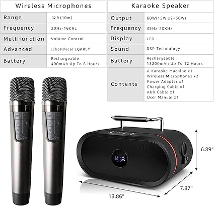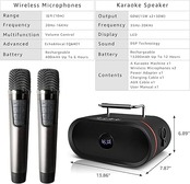 ・♪【RHMspeakerPromise】ご家族に喜ばれる高品質な商品をお届けすることを目指しています。 12か月の保証と、フレンドリーで簡単にアクセスできるテクニカルサポートにより、購入が保証されます。パッケージには、カラオケマシン、2 *ワイヤレスハンドヘルドマイク、電源アダプター、充電ケーブル、AUXケーブル、およびユーザーマニュアルが付属しています。 (暖かいヒント:マイクとマシンを10フィート以内に保つと、最高の音声効果が得られます。)