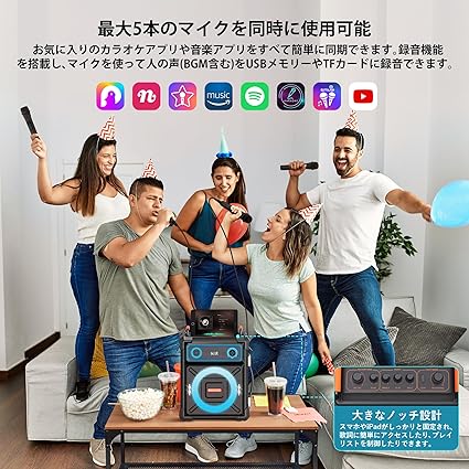 ・【多機能なカラオケセット・最大5本のマイクを同時に使用可能】すべての機能がパネルに非常に鮮明に表示され、初心者でも簡単に操作できます。TFカード(最大32GB)、USB(最大32GB)、AUX INをサポートし、iPhone、Androidスマホ、iPad、TV、PCなどのデバイスと互換性があります。AUX/RCAケーブルを使用してテレビに接続すると、曲を同期して臨場感あふれる家庭用カラオケ体験が楽しめます。2つの6.35MMと1つの3.5MMポートがあり、有線マイクに使用でき、最大5つのマイク(2xワイヤレス + 3x有線)の同時使用をサポートしており、家族や友達と家でカラオケをするのに非常に適しています。お気に入りのカラオケ アプリや音楽アプリをすべて簡単に同期できます。ギターなどの楽器にも使用でき、さまざまなシーンに対応。録音機能を搭載し、マイクを使って人の声(BGM含む)をUSBメモリーやTFカードに録音できます。LCDディスプレイにより、現在の再生モード、音楽番号、接続状態が一目で確認できます。更に、リモコン付き、遠距離(6メートル)操作もできます。
