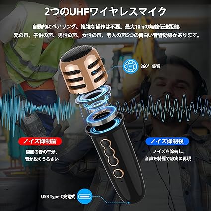 ・【2つのUHFワイヤレスマイク】①2つのワイヤレスマイクは最新のUHF技術を採用し、歌っているときに安定した信号を提供し、有線マイクの煩雑なケーブルから解放されます。スピーカーとマイクの両方がオンになると、マイクは自動的にペアリング、複雑な操作は不要。②2つのワイヤレスマイクは先進的なノイズ抑制技術と専門的なオーディオプロセッサーを搭載し、高感度マイクヘッドを採用しており、ノイズを除去し、発言者の音声を綺麗で忠実に再現します。声飛びや途切れを気にせずに好きなだけ歌ったり話したりできます。③各マイクの音量を個別に調整でき、元の声、子供の声、男性の声、女性の声、老人の声の5つの面白い音響効果を切り替えます。楽しくリラックスしたカラオケパーティーの雰囲気を作ります。スピーカーのエコーつまみでマイクのリバーブ効果を調整できます。