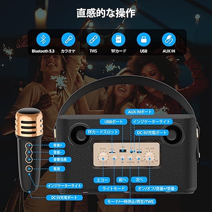 ・【幅広い互換性・持ち運びが簡単】すべての機能がパネルに非常に鮮明に表示され、使いやすいです。TFカード(最大32GB)、USB、AUX INをサポートし、iPhone、Androidスマホ、iPad、TV、PCなどのデバイスと互換性があります。AUX/RCAケーブルを使用してテレビに接続すると、曲を同期して臨場感あふれる家庭用カラオケ体験が楽しめます。USBポートでスマホやタブレットに給電することもでき、キャンプと防災にとても役立ちます。Bluetoothスピーカーは重さがわずか2.1KG、強くて柔らかいベルトが付いており、どこでも持ち運びが簡単です。パーティー、カラオケ、会議、教室、屋外イベント、路上ライブなどに最適!