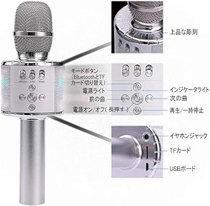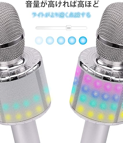 ・♫【多彩なライトで演出】:ミュージックセンサーが搭載しており、音楽のリズムに合わせてカラフルな色を光ります。音量が高ければ高ほどマイクのライトがより速く点滅して、素敵で美しい雰囲気を醸し出しことができます。聴覚だけでなく、視覚的にもお楽しみいただます。いつでもどこでもパーティー気分を盛り上げます!(***ライトを消した状態で使用可能、ただ「M」ボタンを長押します。***)