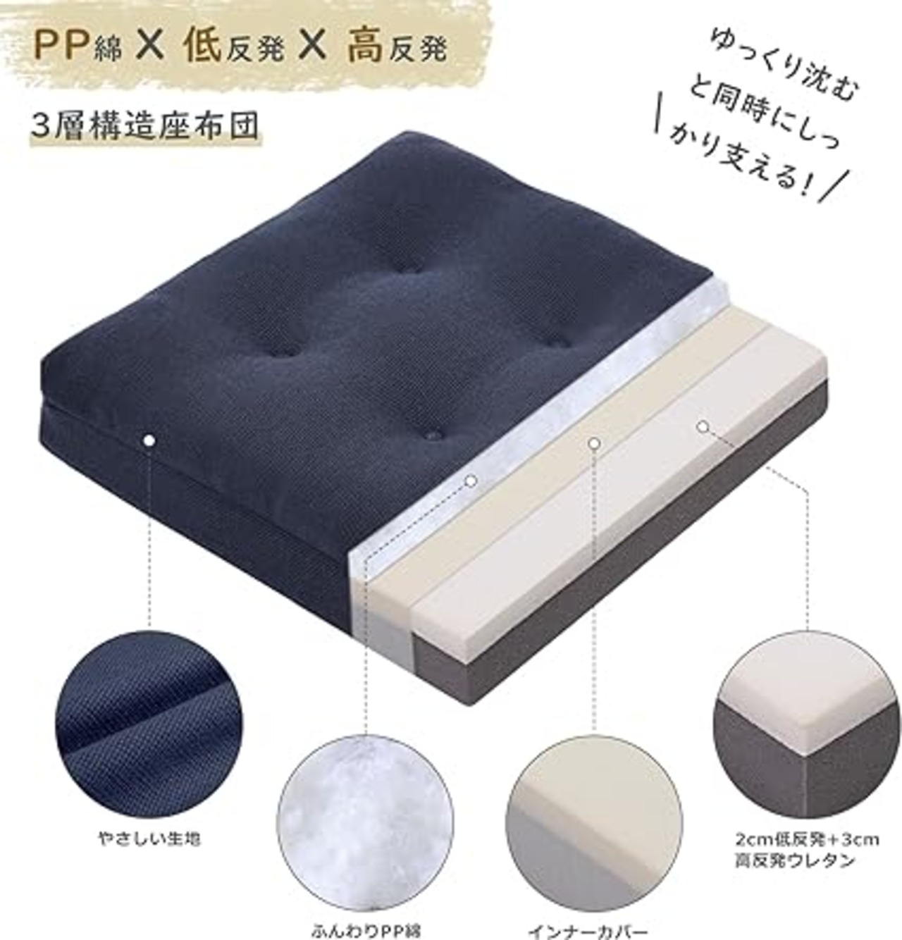・【3層構造-特許品】PP綿+2cm低反発+3cm高反発ウレタンで3つの素材の長所を生かして、身体をやさしく包むようにフィットする感覚で、さらにしっかり支えられている感じもします。