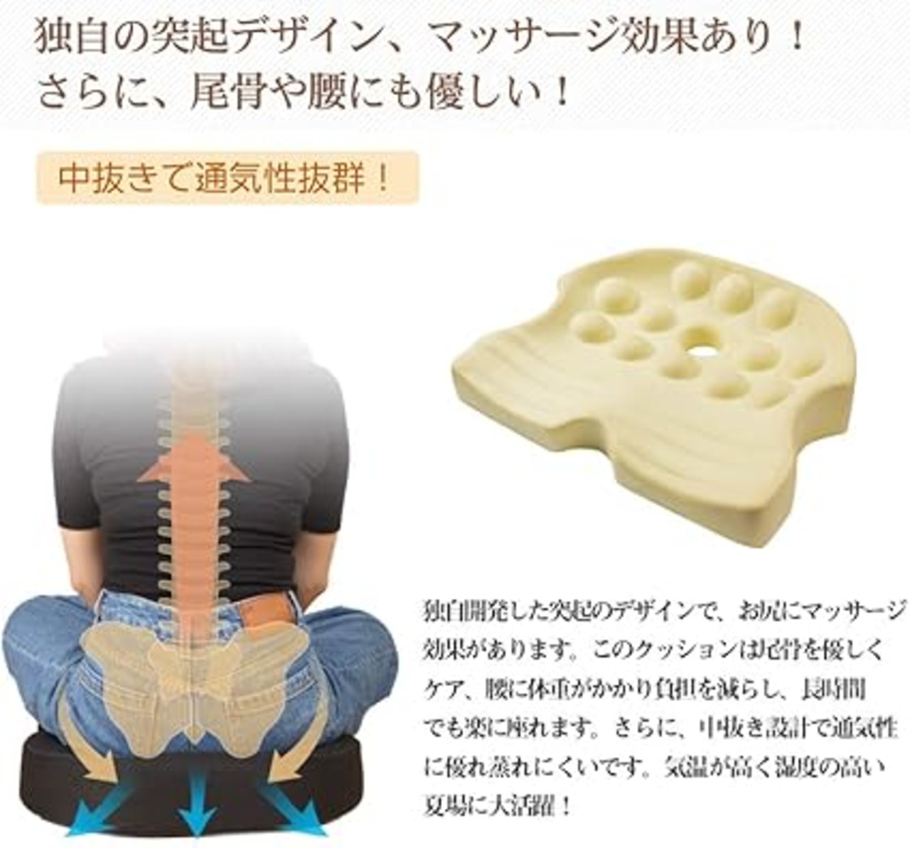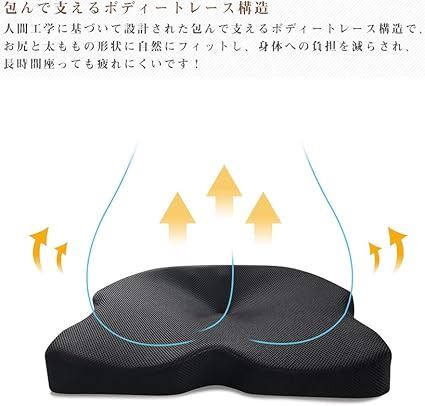 ・【中抜き設計・独創の指圧突起設計】通気性を考慮した中心を空洞にすることによって通気性を良くし、ムレにくくなっています。ざぶとんに季節を問わずご使用いただけます。座布団本体にはいくつかの指圧突起を設けたことにより、お尻の筋肉をリラックスさせてくれます。程よい線形アーチで太もも裏に掛かる体圧を吸収させ、長時間座ることによる足への負担がやわらぎます。