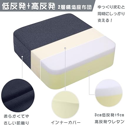 ・【2層構造】3cm低反発ウレタン+9cm高反発ウレタンでゆっくり沈みつつ、しっかり支えられます。お長く座っても座り心地よい。