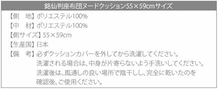 ●素材:側地・ポリエステル100%:中材・ポリエステル100%●サイズ:側地サイズ 約55X59cm●生産国:日本製・必ずカバーを外してからお洗濯ください・お洗濯される場合は中身が片寄らないよう手洗いをお願いします。・お洗濯後は風通しの良い場所で陰干し、乾いた事を確認後にご使用ください。・サイズにつきましては側地サイズとなります。・カバーは付いておりません。