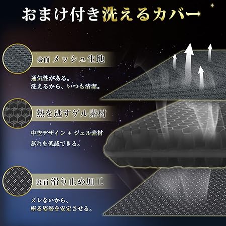 ・【ジェル素材・衝撃吸収】クッション性に富んだゲル素材を使用。ジェルクッション特有のクッション性で座るとき体の重さと座面からの圧迫を吸収。おしりにやさしい。