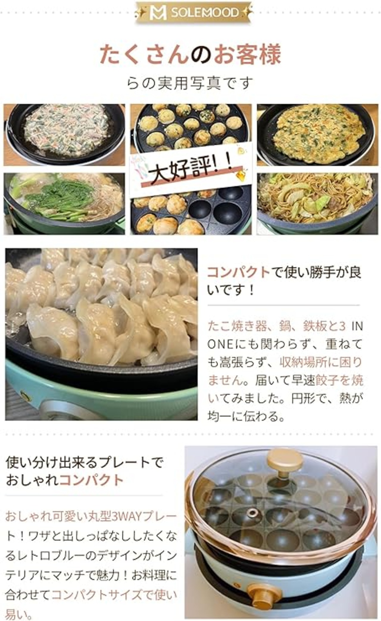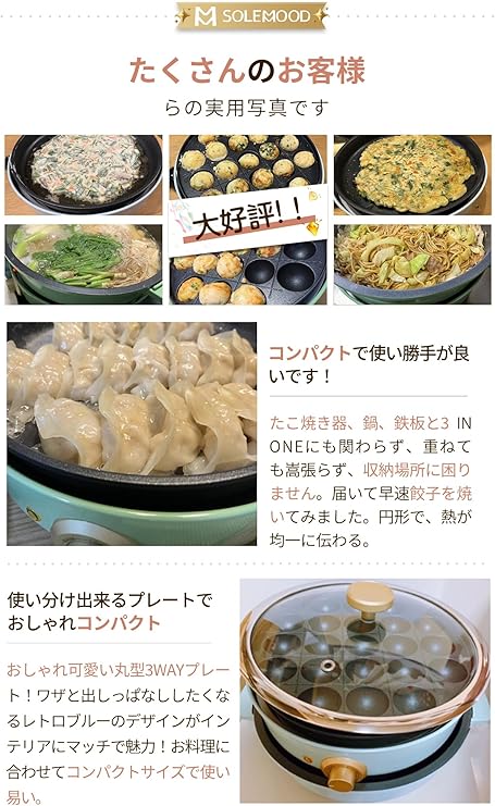 ・【一台多役】付属した三つのプレートで、たこ焼き、焼肉、しゃぶしゃぶ、お好み焼き、野菜炒めなどの様々な料理がチャレンジでき、一人や皆で一緒に料理を楽しむことができ、たこ焼きプレートを一度に24個分を作ることができます。また、透明なガラス蓋が付いているので、調理の様子が確認できて嬉しいです。
