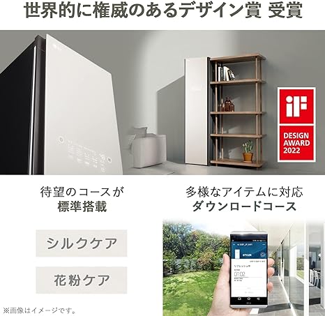 ・【さらに使いやすくなったカスタマイズ機能】 ●花粉ケアコースとシルクケアコースが標準搭載: 従来のダウンロードコースが、操作パネルから選択可能に。LG Stylerが届いた瞬間からお使いいただけます。 ●ダウンロードコースでこんな衣類も: ウール、デニム、レザーまで、あなたの気分に合わせたコーディネートを毎日きれいに。【ズボン折り目ケア機能搭載】 ドアの内側のハンガーにズボンをセットすれば、細かいしわをしっかりとのばしながら、センタープレスラインは美しく保つことができます。