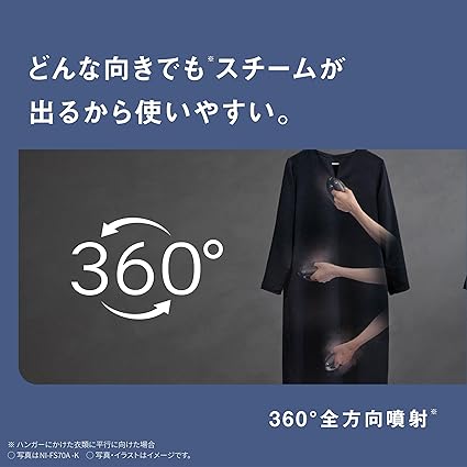 ・360°パワフルスチーム搭載で、どんな向きで使っても(※ハンガーにかけた衣類に平行に向けた場合)スチームたっぷり。