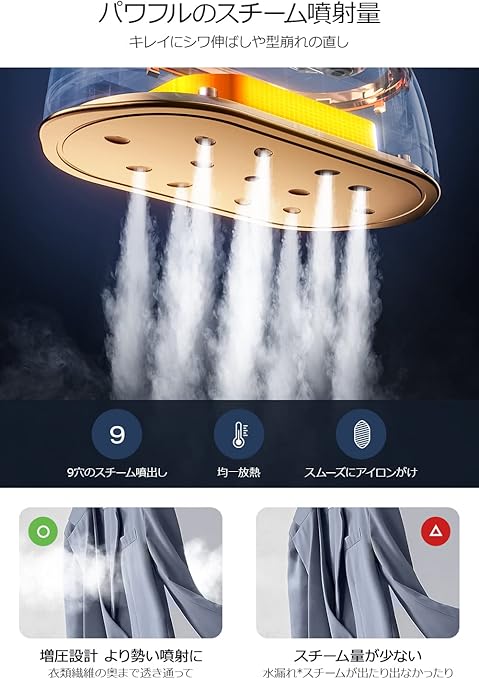 ・【スチーマー&アイロン2WAYモデル】アイロン台を使わずに、ハンガーにかけたままの衣類に蒸気をあててシワ取り・ニオイ取りができて、圧力を使って服にアイロンがけしてシワを伸ばしていくこと可能、スチーム噴射とプレス機能の両方を兼ね備え、スチーム性能向上により、朝の外出前など時間がないときでも手軽に衣類ケアできます。忙しい現代人にとってなくてはならない多機能スチームアイロンです。