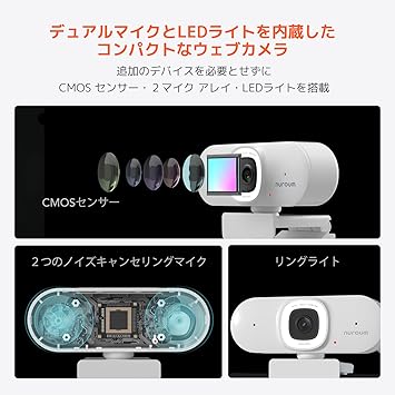 Nuroum Webカメラ 60FPS ライト付き ウェブカメラ 2K オートフォーカス ノイズキャンセリング マイク付き 75°視野角 ミ