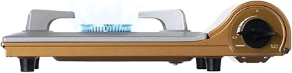カセットガスボンベの異常加熱による爆発を未然に防止する「圧力感知安全機構」のほか、危険防止の為の数々の安全装置が搭載されています 本体サイズ 338(幅)×272(奥行)×84(高さ)mm 重量 約1.2kg カラー ブロンズゴールドテーブル面から五徳(ごとく)トップ位置までの高さがわずか74mm