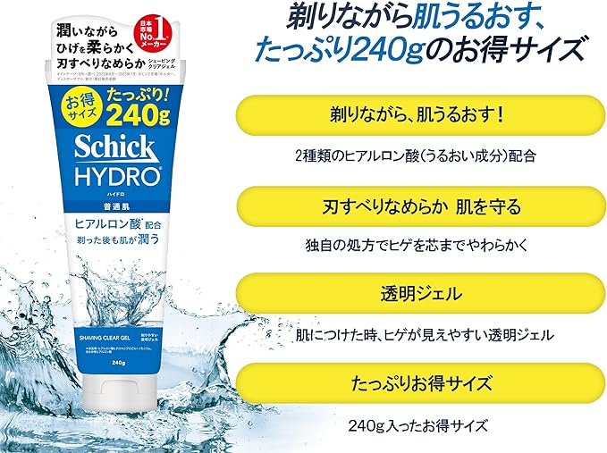 剃る時も肌本来の水分を保ち、しっとりすべすべ肌に。2種類のヒアルロン酸(うるおい成分)配合。独自の処方がヒゲを芯まで柔らかくするので、スムーズにシェービングできます。肌につけた時、ヒゲが見えやすい透明ジェル。シック ハイドロ(カミソリ)とのご使用をお勧めします。
