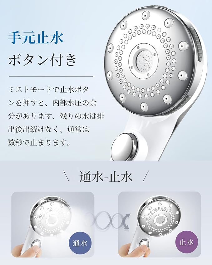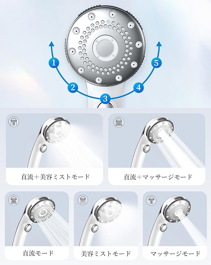 ・【5段階モード切替可&優れた節水性】:5つの水流モード:直流モード:勢いと十分なバブル数を兼ね備えた、最も水圧を感じるモード。直流+マッサージモード:毛穴に詰まった皮脂や汗を浮き上がらせ、一気にシャワーで洗浄。マッサージモード:頭皮や肩、腰などへの水力。マッサージで頭からつま先まで強めの刺激でリラックス。ミストモード:バブル最多の霧状ミストモード。肌あたりが良く、温かく包み込むような使用感で刺激が気になる方にも。ミスト+直流モード:水量も泡数も兼ね備えたモード。程よい水圧でバブルの効果を実感できます。シルキーバスとしても;各モード切り替え可能でお好みに合わせて最適な水流にコントロールできます。全モード節水なので、水道代、ガス代を年間的に大幅に節約し、お財布に優しいです。