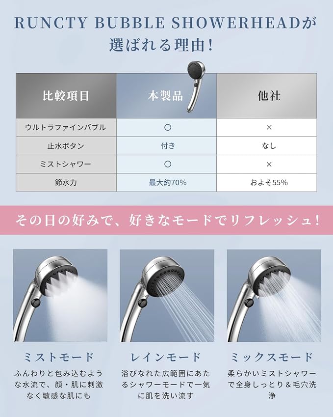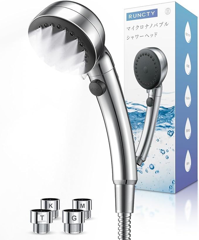RUNCTY シャワーヘッド ミスト 節水 マイクロナノバブル 3段階水流モード 肌ケア 保温 節水シャワーヘッド 手元止水 水漏れ防止 極