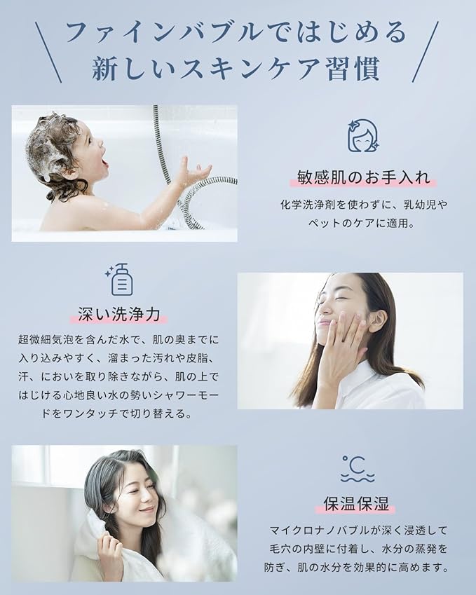 ・【美肌SPA×水分キープ】:マイクロナノバブルとの超微細の気泡を作れるもので、水流は細密で幅広く、まるでシルクのような感じが得られ、毛穴の奥まで汚れを丁寧に洗い流し、きワントーン明るい肌へ導きます。市販品と比べ、水圧調整力も肌触りも向上し、洗浴中に水分が肌から奪われず、肌が乾燥しにくくなり、使用後肌の水分量がなんと30%アップ!一日後の疲れを解消には最適!