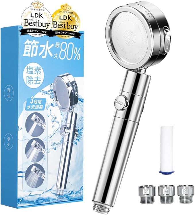 【LDKベストバイ3冠受賞】日丸屋製作所 シャワーヘッド 日本製塩素除去剤 節水 浄水 止水ボタン 水流調整 角度調整 アダプター付 国際基