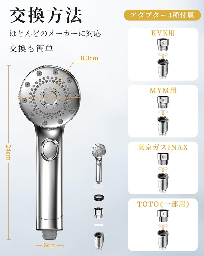 ・【国際汎用基準・安心保証】:国際汎用基準G1/2インターフェースで、ほどんどのホース種類に対応可能です。工具不要でM/K/G/T4種類のジョイント付き、自宅のシャワーヘッド規格によって簡単に取付けられます。なお、弊店のシャワーヘッドは、ご購入日より6ヶ月の保証が付いておりますので、万が一製品に不具合が発生した場合は弊店にお気軽にお問い合わせください。