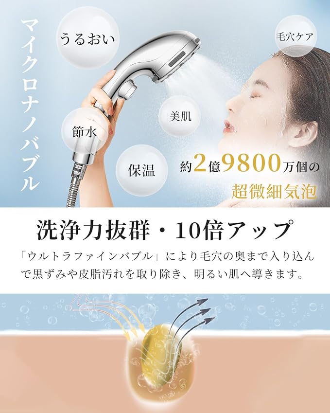 ・【超微細泡&高洗浄力】:バブル数最大で2億9800万個に達して水を超微細な泡に変えることで通常の水よりも優れた洗浄力を発揮でき、肌の毛穴の汚れや化粧品などを効果的に取り除き、つややかな肌を実現します。