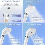 ・◆目的にあわせて選べる3つの水流モードで手元で簡単に切り替えできます。1ミストクレンズモード:顔などの刺激を避けたい部位に。超微細泡で肌のキメや穴に入り込んだ汚れをやさしく洗浄。2バブルクレンズモード:全身に浴びたいときに。やわらかい肌あたりながらファインバブルの効果でしっかり洗浄。3ストレートモード:髪や身体の洗い出しに。強めの水流でサッと洗い流す。