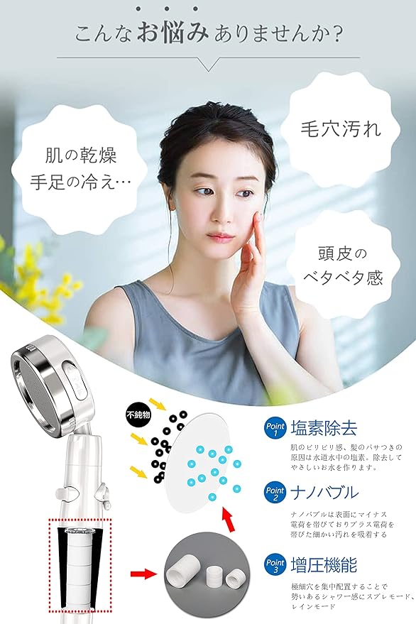 ・【超微細泡&塩素除去】今まで他社製品と比較して、最新改良したのシャワーヘッドは、0.02mmの超微細孔と特殊構造のマイクロバブルにより、通常の水よりも優れた洗浄力を発揮します。肌の毛穴の汚れや化粧品などを効果的に取り除き、つややかな肌を実現します。シャワーヘッドの塩素除去カートリッジは原水を濾過し、塩素を徹底的に除去可能です。肌や髪に優しいシャワーヘッドなので、お肌が敏感な方もご安心ください